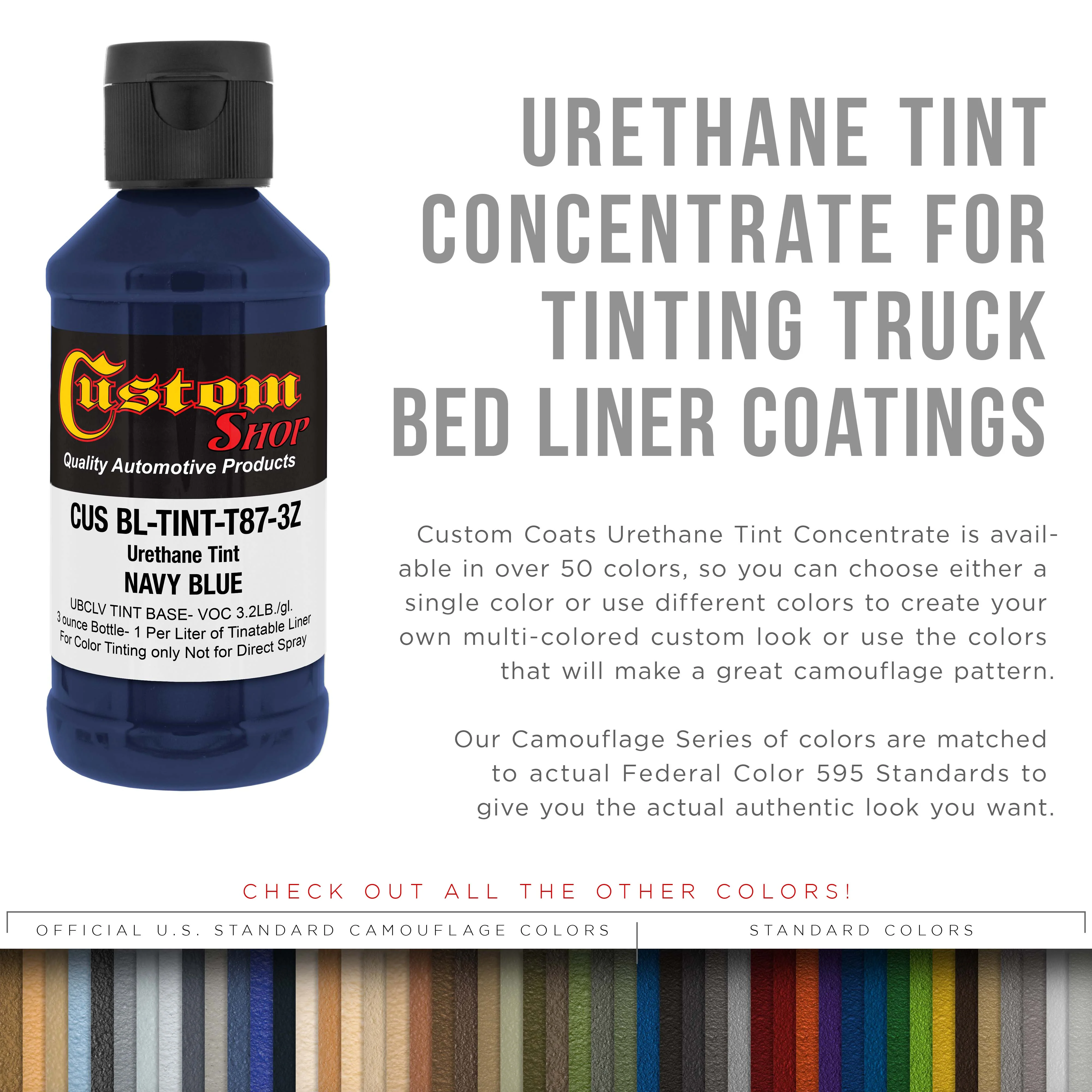 - Custom Coats Urethane Tint Concentrate is available in over 50 colors, so you can choose either a single color or use different colors to create your own multi-colored custom look or use the colors that will make a great camouflage pattern. Our Camouflage Series of colors are matched to actual Federal Color 595 Standards to give you the actual authentic look you want.